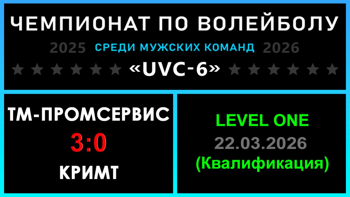 UVC-6 (Мужчины): Чемпионат UVC Лиги по волейболу среди мужских команд 2025-2026 гг. Результаты игры: LEVEL ONE (Квалификация) 22.03.2026 Тм-Промсервис - КрИМТ 3:0 (25:11, 25:9, 25:12) Тм-Промсервис отправил КрИМТ в LEVEL HOPE, а сам продолжит бороться в LEVEL ONE! «Nostradamus trophy» - конкурс для участников группы ВКонтакте: ✅ 39 - количество участников, которые смогли предсказать точный исход матча! #UVC_ЛИГА_ЧЕМПИОНАТ_UVC_6_Мужчины