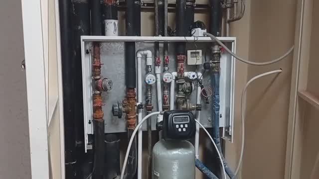 Система умягчения воды в Московской квартире. Умягчитель врезан в стояк холодной воды.
