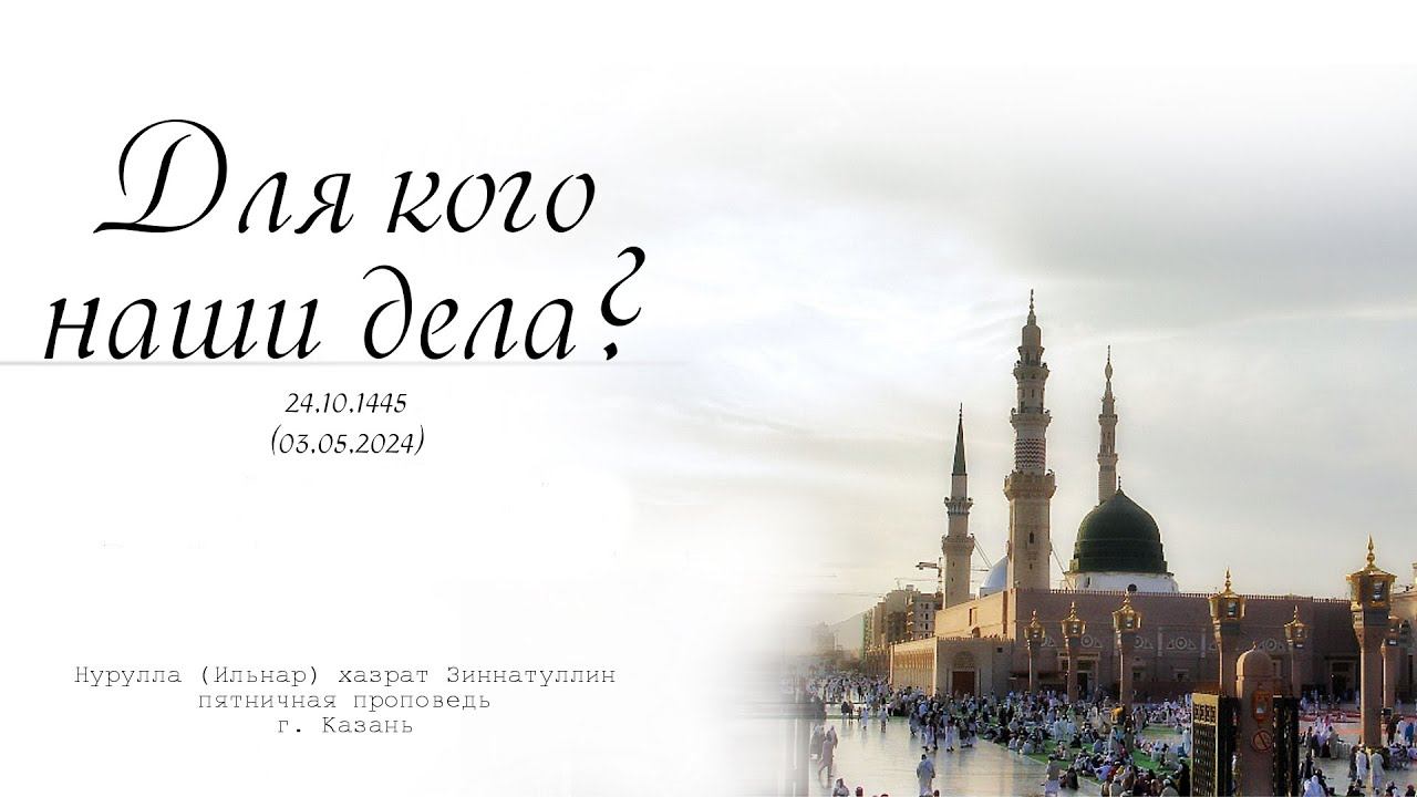 Пятничная проповедь на тему "Для кого наши дела?", г. Казань Нурулла (Ильнар) хазрат Зиннатуллин. 03 мая, 2024 год. Мы в соц.сетях: Telegram: https://t.me/ilnarmulla Вконтакте: https://vk.com/ilnarmulla Одноклассники: https://ok.ru/ilnarmulla Rutube: https://rutube.ru/channel/54594025/
