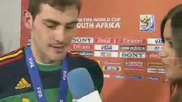 Футбол - Поцелуй чемпиона Пн. 12/07/2010 - 12:28 Голкипер сборной Испании Икер Касильяс не смог удержаться, чтобы не поцеловать свою девушку, которая брала у новоиспеченного чемпиона мира интервью.