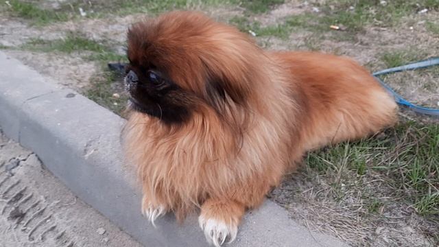 Пекинес Дендик снова у дороги наблюдает за машинами