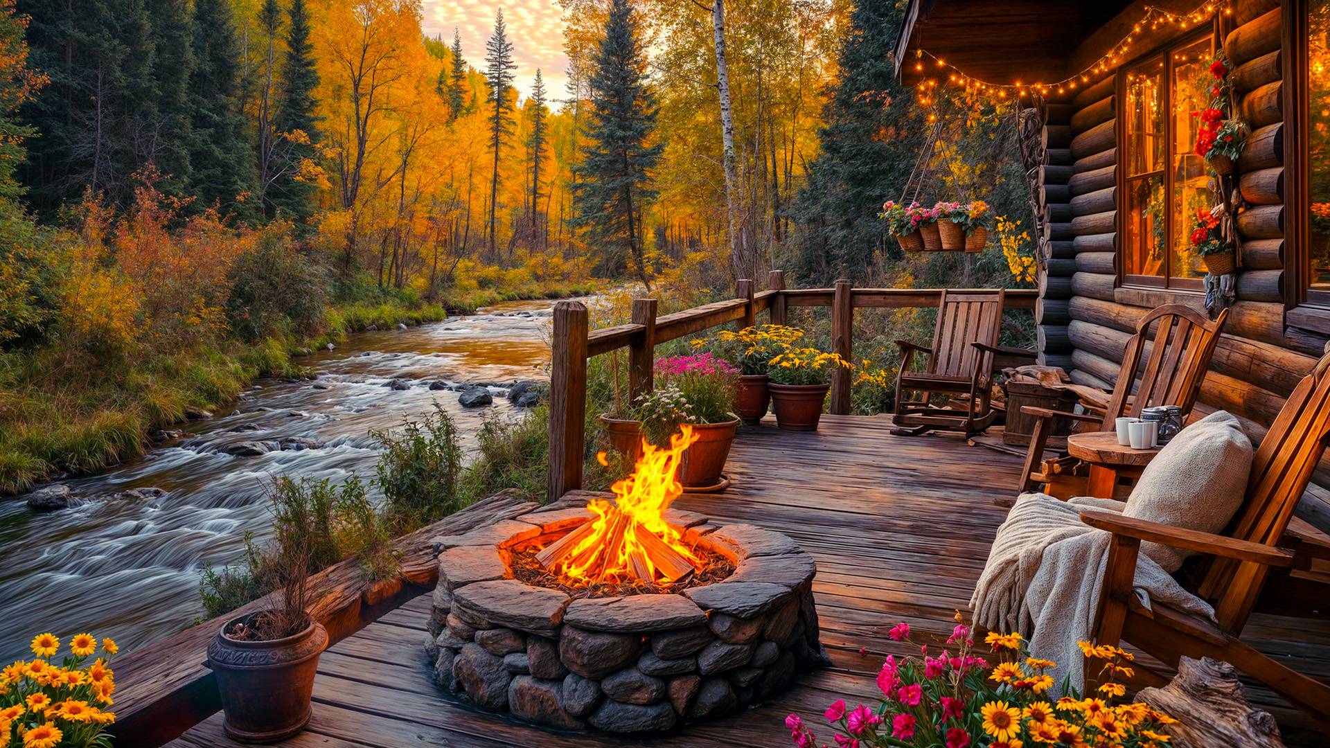 🍁 Уютная Осенняя Атмосфера Веранды на Берегу Реки 🌊 Тёплый Костер, Звуки Текущей Воды и Птиц