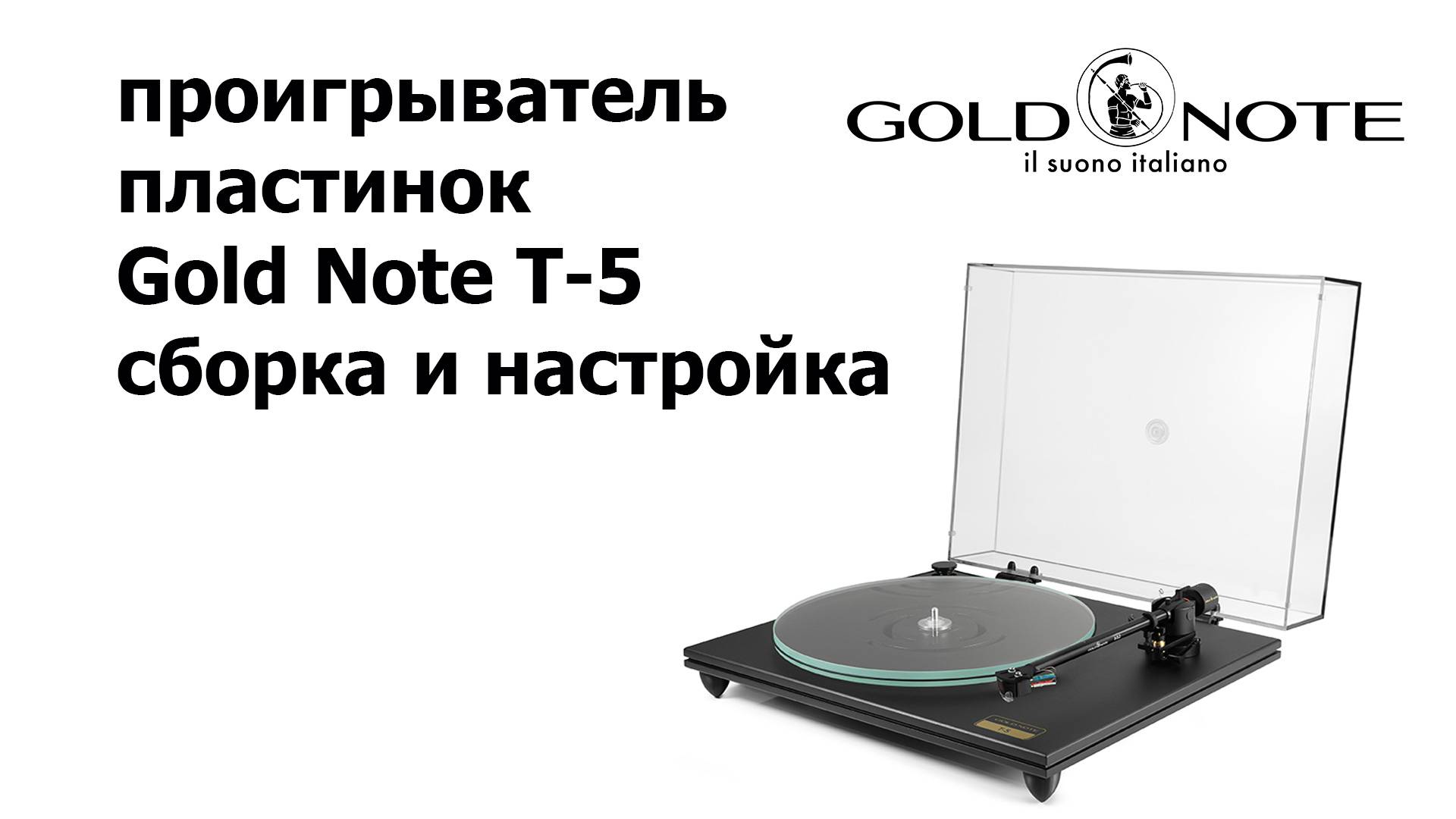 Самый недорогой проигрыватель пластинок компании Gold Note, модель T-5. Комплект с установленным тонармом, в комплекте прозрачная крышка. Видео демонстрирует процесс сборки и настройки проигрывателя.