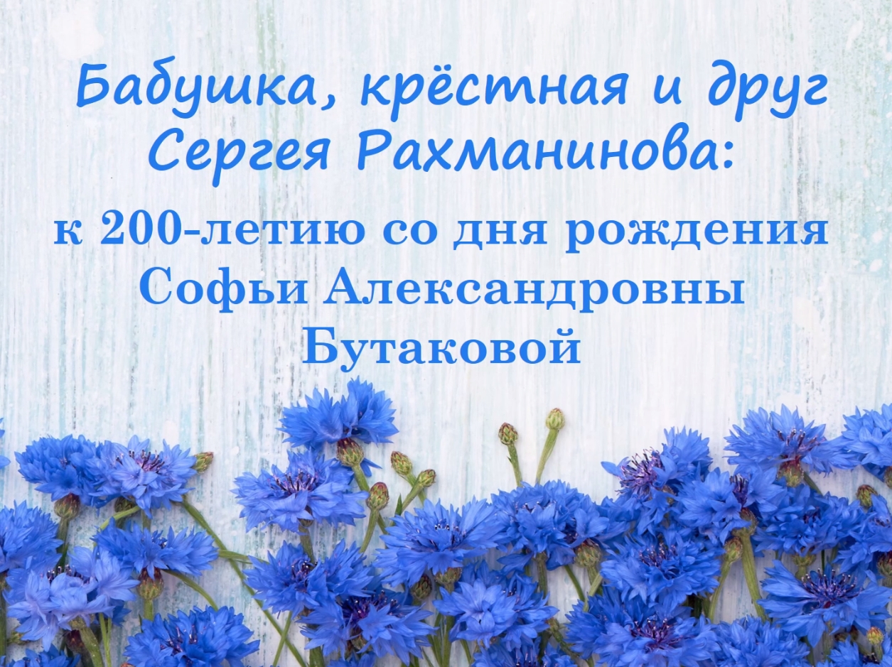 «Бабушка, крестная и друг Сергея Рахманинова: к 200-летию со дня рождения Софьи Александровны Бутаковой» О Софье Александровне Бутаковой, о ее важном месте в сердце и биографии Сергея Васильевича Рахманинова также повествует предлагаемая вашему вниманию одноименная виртуальная выставка. Справки по телефону: 8 (8162) 77-37-88, отдел краеведения.