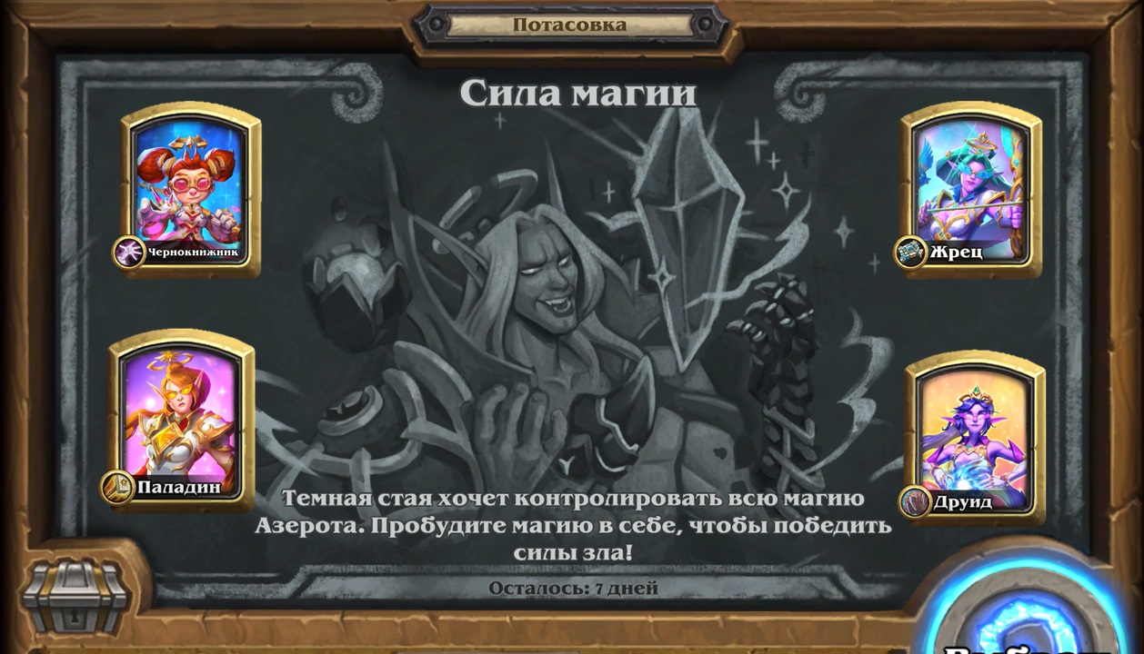 Потасовка в Hearthstone, в период с 07.09.2022 - 14.09.2022 Потасовка: Сила магии Тёмная стая хочет контролировать всю магию Азерота. Пробудите магию в себе, чтобы победить силы зла!