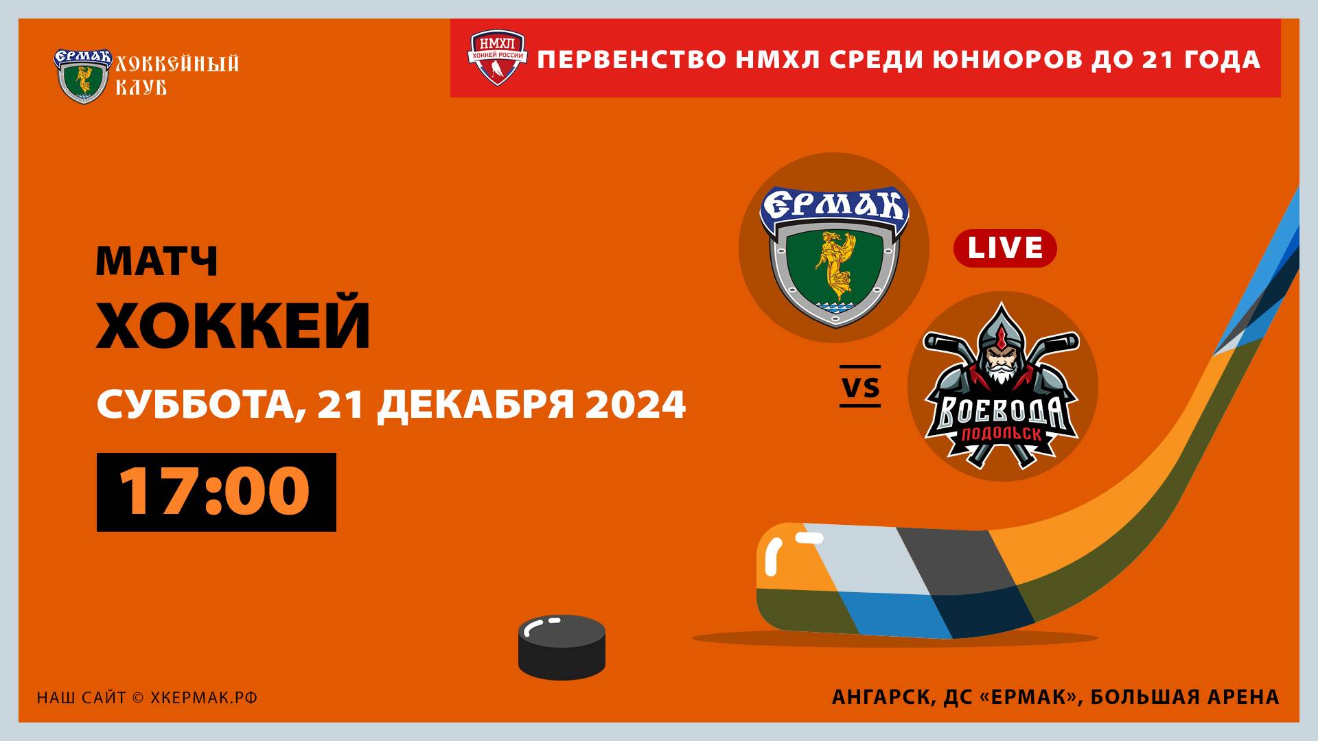 Матч между командами «Ермак» (Ангарск) и «Воевода» (Подольск) в рамках Первенства Национальной молодёжной лиги среди юниоров до 21 года. Конференция «Запад». Первый этап. Сезон 2024/25 годов. 21 декабря 2024 года. г. Ангарск, ДС «Ермак», большая арена