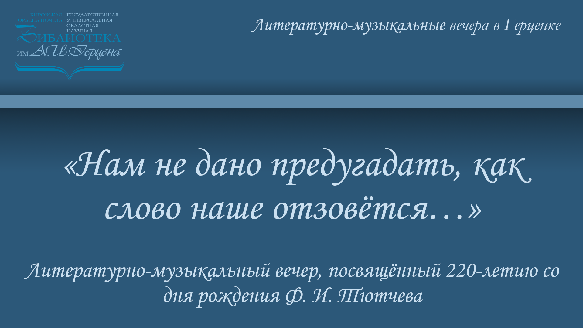 5 декабря в Конференц-зале в рамках проекта «Лишь слову жизнь дана» состоялся литературно-музыкальный вечер «Нам не дано предугадать, как слово наше отзовётся…», посвящённый 220-летию со дня рождения Ф. И. Тютчева. Вместе с солистами и чтецами вокально-оперной студии «Орфей» Областного дома народного творчества города Кирова гости события на полтора часа окунулись в волшебный мир лирики этого мастера стиха, вспомнили основные вехи его творческой и житейской судьбы, а также заслуги перед Отечеством как дипломата и политика. В вечере приняли участие: Татьяна Конухова (руководитель), Елена Городничева (концертмейстер), Светлана Бестужева, Александр Бояринцев, Наталья Голомидова, Юлия Култынова, Александр Ротц, Оксана Филимонова, Олег Четвериков и студентка филологического факультета ВятГу Мария Дёмина.
