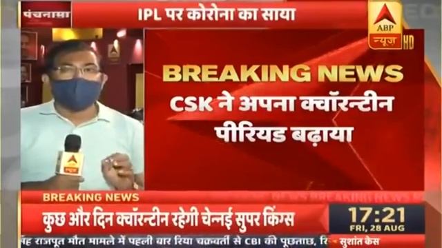 A player of Chennai Super Kings has been infected with Coronavirus. 12 support staff of this team are also infected. Sources have given information about this. After Corona's case, the team has extended the quarantine period for a week. In UAE, there is a quarantine period of six days for each team. Its deadline is ending tomorrow. After the Corona case comes to light, the players of the team will now remain in the Quarantine. #ChennaiSuperKings #Coronavirus #ABPNewsLive To Subscribe our YouTube channel here: https://www.youtube.com/user/abpnewstv Download ABP App for Apple: https://itunes.apple.com/in/app/abp-live-abp-news-abp-ananda/id811114904?mt=8 Download ABP App for Android: https://play.google.com/store/apps/details?id=com.winit.starnews.hin&hl=en About Channel: ABP News is a news hub which provides you with the comprehensive up-to-date news coverage from all over India and World. Get the latest top stories, current affairs, sports, business, entertainment, politics, astrology, spirituality, and many more here only on ABP News. ABP News is a popular Hindi News Channel made its debut as STAR News in March 2004 and was rebranded to ABP News from 1st June 2012. The vision of the channel is 'Aapko Rakhe Aagey' -the promise of keeping each individual ahead and informed. ABP News is best defined as a responsible channel with a fair and balanced approach that combines prompt reporting with insightful analysis of news and current affairs. ABP News maintains the repute of being a people's channel. Its cutting-edge formats, state-of-the-art newsrooms commands the attention of 48 million Indians weekly. Watch Live on http://abpnews.abplive.in/live-tv ABP Hindi: http://abpnews.abplive.in/ ABP English: http://www.abplive.in/ Social Media Handles: Instagram: https://www.instagram.com/abpnewstv/?hl=en Facebook ABP News (English): https://www.facebook.com/abplive/?ref=br_rs Facebook: https://www.facebook.com/abpnews/ Twitter: https://twitter.com/abpnews ?Watch ABP News Live 24/7 https://www.youtube.com/watch?v=nyd-xznCpJc