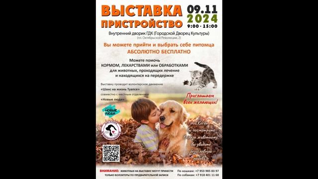 В Туапсе 09.11.2024 пройдет очередная (пятая в 2024 году) выставка пристройство бездомных животных.