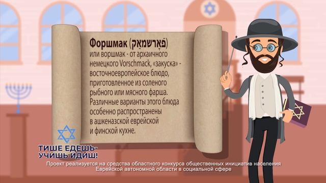 Форшмак (קאַמשראָפֿ) или воршмак - от архаичного немецкого Vorschmack, «закуска» - восточноевропейское блюдо, приготовленное из соленого рыбного или мясного фарша. Различные варианты этого блюда особенно распространены в ашкеназской еврейской и финской кухне. Проект «Тише едешь – учишь идиш» - это серия радио- и видеороликов, состоящих из основных и популярных фраз на идиш и их переводом на русский язык. Проект АНО «Центр позитивных медиа «Восточный вектор» «Тише едешь – учишь идиш» реализуется при грантовой поддержке правительства ЕАО на реализацию общественных инициатив населения Еврейской автономной области в социальной сфере.