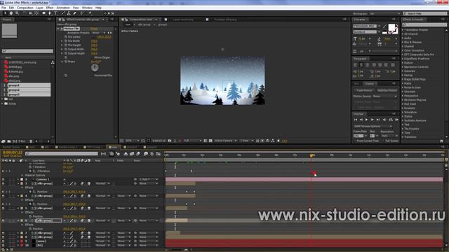 http://nix-studio-edition.ru/tutorials/after-effects/1008-zimnee-intro.html Сразу скажу что это видео обучалка предназначена для достаточно опытных пользователей After Effects, и подразумевает ОБЯЗАТЕЛЬНОЕ наличие базовых знаний и умений работы в этой программе. В целом мы создадим новогоднее интро, с елками, снегом, титрами и с 3д переходами.