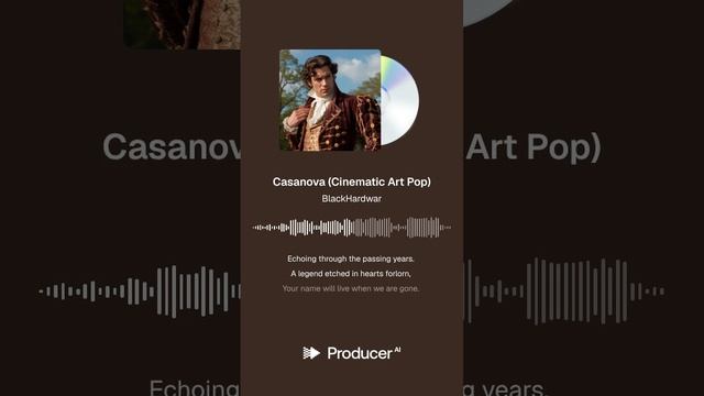 Casanova (Cinematic Art Pop) cinematic art pop ballad, swelling synths, haunting piano, atmospheric textures, deep electronic drums, soulful female vocals, emotional buildup with dramatic strings, slow tempo, lush and spacious production, minor key https://www.producer.ai/BlackHardwar https://songly.gift/ru/app/videos/create https://sinonim.org/song#res Lyrics (Verse 1) In halls of charm, where shadows play, You weave your spell, then slip away. Casanova, a name whispered low, A heartbreaker, putting on a show. You paint a dream, then watch it fade, A masterpiece of love betrayed. (Chorus) Casanova, generator of tears, Echoing through the passing years. A legend etched in hearts forlorn, Your name will live when we are gone. A legacy of love and pain, Forever in the pouring rain. (Verse 2) A fleeting touch, a stolen kiss, A moment's bliss, then emptiness. You build them up, then let them fall, Ignoring every desperate call. A phantom love, a cruel facade, A path of sorrow you have trod. (Chorus) Casanova, generator of tears, Echoing through the passing years. A legend etched in hearts forlorn, Your name will live when we are gone. A legacy of love and pain, Forever in the pouring rain. (Bridge) But in the echoes of their cries, A truth remains behind your lies. A lonely soul, forever bound, To seek a love you never found. (Chorus) Casanova, generator of tears, Echoing through the passing years. A legend etched in hearts forlorn, Your name will live when we are gone. A legacy of love and pain, Forever in the pouring rain. (Outro) On the wind, your name will fly, Casanova, beneath the sky. A legend born of love and lies, Reflected in a woman's eyes.