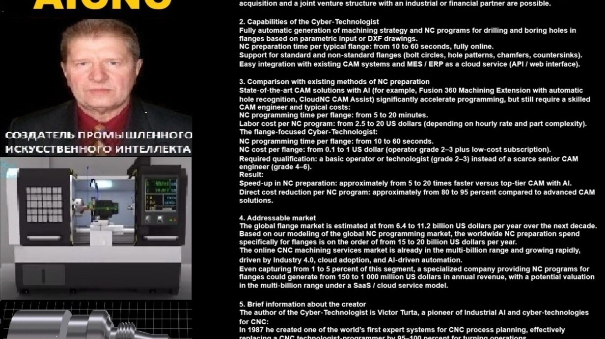 1. Offer to sell We offer to sell an equity stake (from 0,1 to 100 percent) in a unique cloud‑based Cyber‑Technologist for online CNC program (NC) generation for drilling and boring holes in flanges, including transfer of core algorithms and global commercialization rights. Both a full technology acquisition and a joint venture structure with an industrial or financial partner are possible. 2. Capabilities of the Cyber‑Technologist Fully automatic generation of machining strategy and NC programs for drilling and boring holes in flanges based on parametric input or DXF drawings. NC preparation time per typical flange: from 10 to 60 seconds, fully online. Support for standard and non‑standard flanges (bolt circles, hole patterns, chamfers, countersinks). Easy integration with existing CAM systems and MES / ERP as a cloud service (API / web interface). 3. Comparison with existing methods of NC preparation State‑of‑the‑art CAM solutions with AI (for example, Fusion 360 Machining Extension with automatic hole recognition, CloudNC CAM Assist) significantly accelerate programming, but still require a skilled CAM engineer and typical costs: NC programming time per flange: from 5 to 20 minutes. Labor cost per NC program: from 2.5 to 20 US dollars (depending on hourly rate and part complexity). The flange‑focused Cyber‑Technologist: NC programming time per flange: from 10 to 60 seconds. NC cost per flange: from 0.1 to 1 US dollar (operator grade 2–3 plus low‑cost subscription). Required qualification: a basic operator or technologist (grade 2–3) instead of a scarce senior CAM engineer (grade 4–6). Result: Speed‑up in NC preparation: approximately from 5 to 20 times faster versus top‑tier CAM with AI. Direct cost reduction per NC program: approximately from 80 to 95 percent compared to advanced CAM solutions. 4. Addressable market The global flange market is estimated at from 6.4 to 11.2 billion US dollars per year over the next decade. Based on our modeling of the global NC programming market, the worldwide NC preparation spend specifically for flanges is on the order of from 15 to 20 billion US dollars per year. The online CNC machining services market is already in the multi‑billion range and growing rapidly, driven by Industry 4.0, cloud adoption, and AI‑driven automation. Even capturing from 1 to 5 percent of this segment, a specialized company providing NC programs for flanges could generate from 150 to 1 000 million US dollars in annual revenue, with a potential valuation in the multi‑billion range under a SaaS / cloud service model. 5. Brief information about the creator The author of the Cyber‑Technologist is Victor Turta, a pioneer of Industrial AI and cyber‑technologies for CNC: In 1987 he created one of the world’s first expert systems for CNC process planning, effectively replacing a CNC technologist‑programmer by 95–100 percent for turning operations. He implemented real industrial Cyber‑Technologists for turning and drilling / boring operations long before Western cloud CAM and AI‑CAM solutions appeared. He has decades of hands‑on experience in mechanical engineering, machining algorithms and building online services for manufacturing.