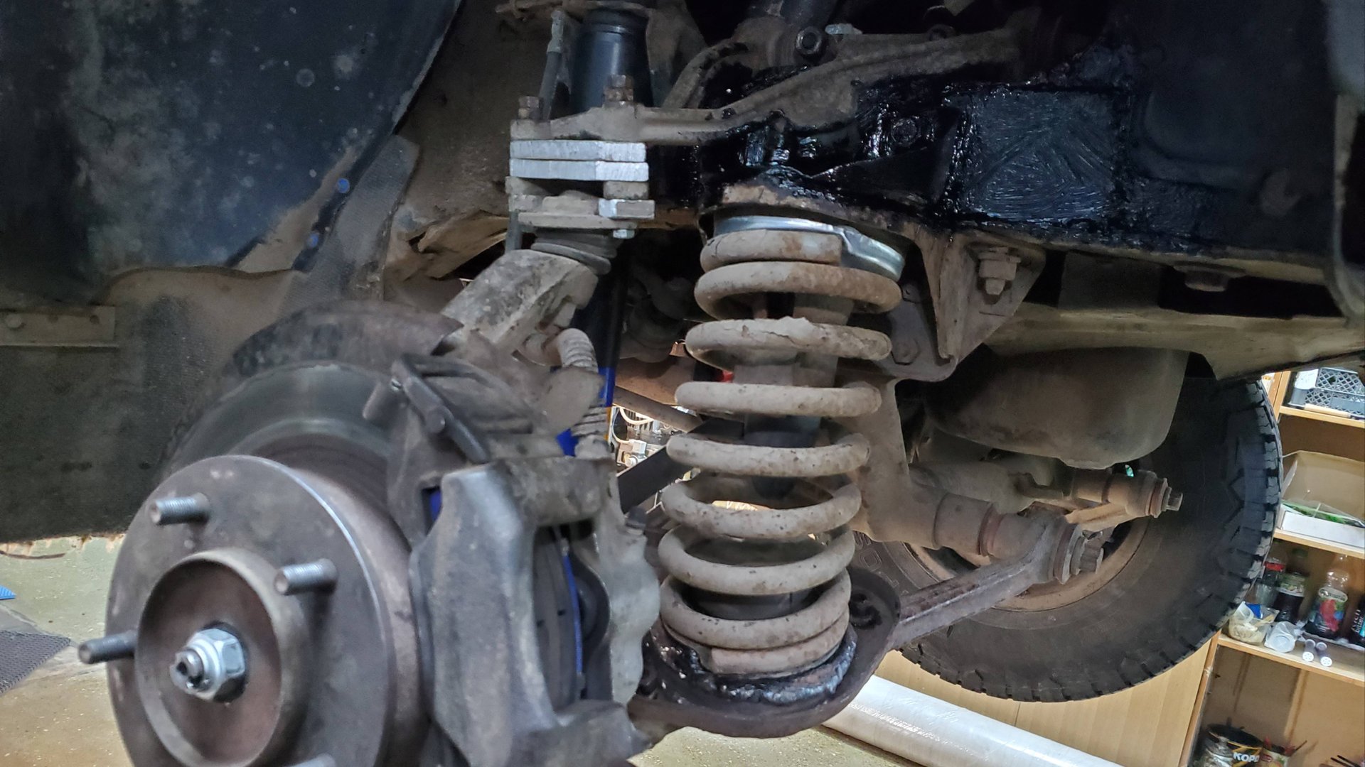 После установки новых колёс постоянно терли передние арки. Долго собирал запчасти для капитального ремонта, в итоге все собрал и загнал на установку. Как оказалось пружины от Волги куплены зря, слишком они длинные на обычную ниву. Для шнивы самое то.