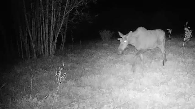 Молодой самец лося кормится в тёмное время суток