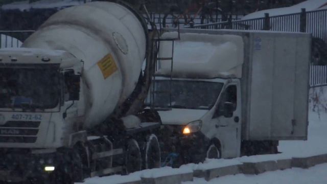 Автобетономешалка берет на буксир Газель зимой.