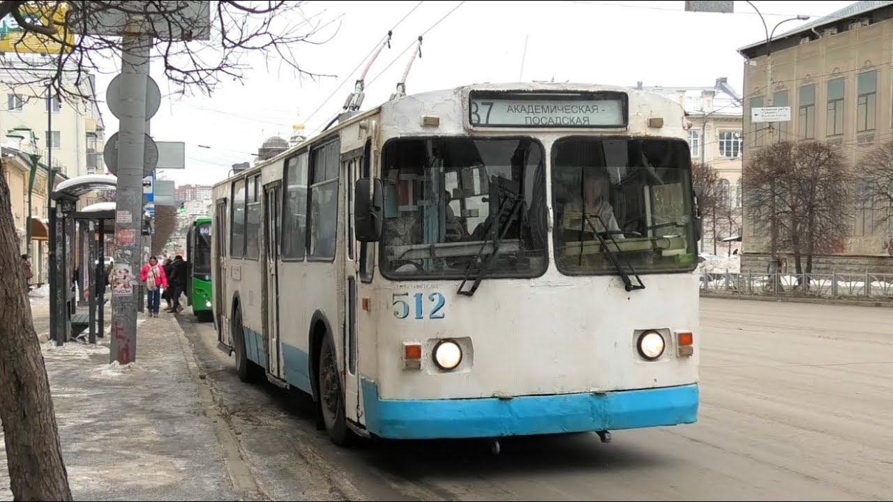 Троллейбус ЗиУ-682Г [Г00] борт. №512 маршрут №37 "Академическая - Посадская" следует через остановку "Гостиница Центральная". Город Екатеринбург, Россия. Приписка: Орджоникидзевское троллейбусное депо. 29.02.2024 С 1 марта 2024 г. маршрут №37 полностью заменен новыми троллейбусами БКМ 32100D «Ольгерд».