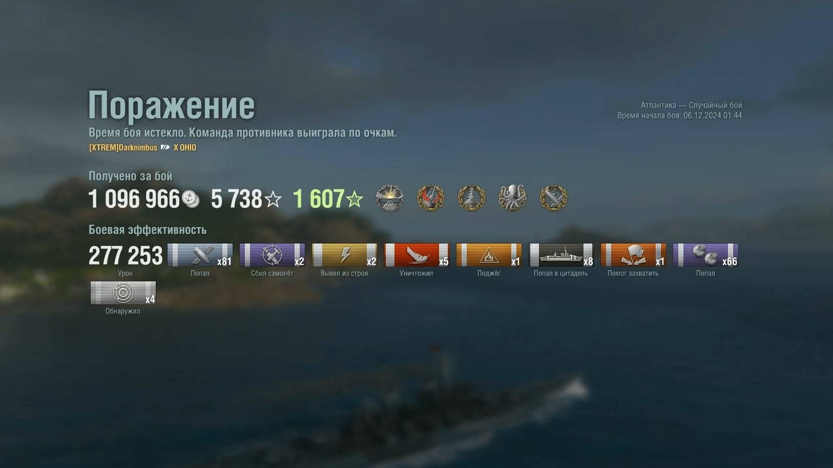 Линкор Ohio. Игрок: Darknimbus (EU). Карта: Атлантика - Случайный бой. Урон: 277к. Ohio - Линкор США 10 уровня.