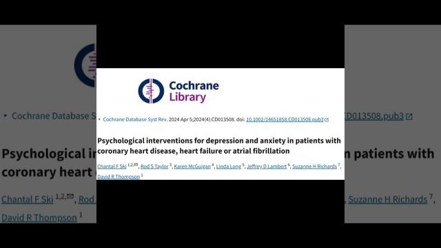 Кокрейновская база данных Syst Rev. 5 апреля 2024 г.; 2024(4):CD013508. DOI: 10.1002/14651858.CD013508.pub3 Психологические вмешательства при депрессии и тревоге у пациентов с ишемической болезнью сердца, сердечной недостаточностью или фибрилляцией предсердий https://pmc.ncbi.nlm.nih.gov/articles/PMC10996021/