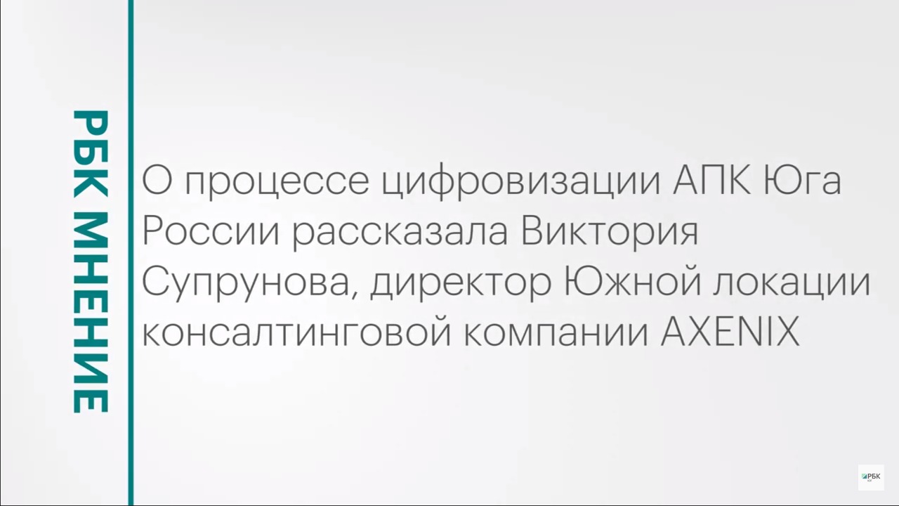 О процессе цифровизации АПК Юга России рассказала Виктория Супрунова, директор Южной локации консалтинговой компании AXENIX. Подписывайтесь на нас в социальных сетях: ВКонтакте: https://vk.com/rbcyug Telegram: https://t.me/rbc_krasnodar, https://t.me/rbcrostov, https://t.me/rbc_kavkaz Подпишитесь на канал РБК Юг, чтобы смотреть новые выпуски первыми!