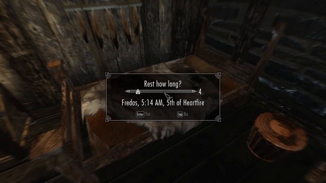 Lord Vensor has got a new voice. How interesting. But what is that mysterious bumping sound? BEGIN MODLIST A Matter of Time - A HUD clock widget v2.0.7 A Quality World Map and Solstheim Map - With Roads v8.4 Alternate Start - Live Another Life v3.0.1 Alternate Ancient Shrouded Armor v1 Animated Clutter v1.9 Animated Dwemer Lift Load Doors v1.1 Arissa - The Wandering Rogue v2.2.2 Audio Overhaul for Skyrim 2 v2.1 Better Dialogue Controls v1.2 Better MessageBox Controls v1.2 Better Shrouded Armor v3 Book Covers Skyrim v2.9.3 Brawl Bugs Patch v1 Campfire v1.11 Civil War Overhaul v4.0.1??? (I just had it lying around... one cannot download this anymore for some reason) Climates of Tamriel V v5 Convenient Horses v5 Deadly Dragons v6.3.5 Designs of the Nords - Banners v1.5 Dovahkiin Relaxes Too v1.7 Dragon Combat Overhaul v3.7FINAL??? (I just had it lying around... one cannot download this anymore for some reason) Enhanced Lights and FX v2.0 Equipping Overhaul v3.13 (Not using Realistic Unequip due to how the game handles hotkeyed spells) Even Better Quest Objectives v1.5.8a Extensible Follower Framework v4.0.2 Falskaar v1.1.4 Falskaar - Climates of Tamriel patch v1.1 Familiar Faces v1.0.5 Follower Commentary Overhaul v1.3 Footprints v0.99 Footprints - Ash v0.99 Fores New Idles in Skyrim v6.3 Forgotten Retex Project v2.4 Frostfall v3.4 Frostfall - Belt-Fastened Quivers v1.2 Gildergreen Regrown v1.2.6 Guard Dialogue Overhaul v1.4 Harvest Overhaul v2.8.2 Helgen Reborn v105.3 Hold Border Banners v1 Hoth - Follower v3 Immersive Armors v8 Immersive HUD v3.0.02 Imperious - Race changes v7.16 iNeed - Food, Water and Sleep v1.602 Inconsequential NPCs v1.9c JaySuS Swords v13D JaySuS Swords compatibility patches v14 JContainers - data storage framework v0.67.5 Localized Thieves Guild Jobs v3.04 Lockpick graduation v1 Magic Duel Reborn v1.1 Mammoth Manor v1.2 Moon and Star v1.11 Moonlight Tales - Werewolf and Werebear Overhaul v2.33 moreHUD v2.1.3 No Snow Under The Roof v2.3 Perkus Maximus - Maximum Perk Overhaul v1.7.000001 PerMa Compatibility and PaMa Patches v3.4.1.1 Predator Vision v1.3 Pumping Iron v1.0.1 RaceMenu v2.9.1 Real Shelter v1.2 Realistic Boat Bobbing v2.4.8 Realistic Water Two v1.11 Run For Your Lives v2.1.0 SkyFalls + SkyMills v3.3.1 Skyrim -Community- Uncapper v1.15.2 Skyrim HD - 2K Textures v1.6 SkyUI v5.1 Skyrim Redone (Enemy AI module) v1.3 Smoking Torches v1.4 Splash of Rain v1.051 Static Mesh Improvement Mod v1.7.4 Sword of the Ancient Tongues v1 The Choice is Yours - Fewer Forced Quests v1.4 The Paarthurnax Dilemma v1.2.8 Thieves Guild Requirements - No Auto Quest Start v2.1 Touring Carriages v2.2.1 TTYM - Think To Yourself Messages v1.4 Undeath v1.3 Unique Uniques v1.7a Unofficial High Resolution Patch v1.19a Unofficial Skyrim Legendary edition Patch v3.0.7 VioLens - A Killmove Mod v1 Weapons and Armor Fixes Remade v5.2 Wet and Cold v1.422 Wet and Cold - Ashes v1.09 Wet and Cold - Holidays v1.07 When Vampires Attack v2.1.0 Winter Is Coming - Cloaks v2.3 END MODLIST The intro and outro are snippets from Tchaikovsky's 1812 Overture performed by the Skidmore College Orchestra.