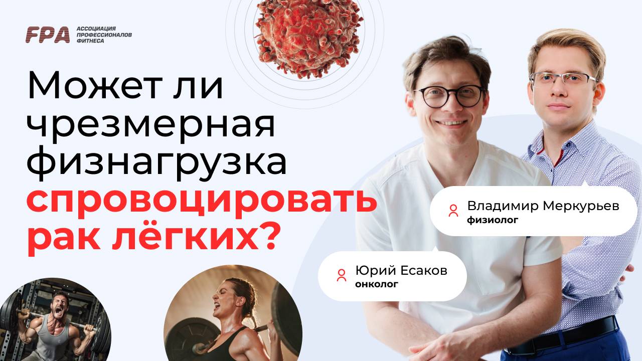 Может ли чрезмерная физнагрузка спровоцировать рак лёгкого?Рассказывает онколог Юрий Есаков. Смотрите вебинар «Онкология и фитнес» по ссылке: https://youtu.be/lWGvEa6th5E Эфир ведут торакальный хирург, онколог, заведующий отделением торакальной хирургии Онкоцентра ГКБ имени С. С. Юдина, к. м. н. Юрий Есаков и к. б. н., физиолог, эксперт-преподаватель FPA Владимир Меркурьев. Юрий Есаков: https://www.instagram.com/dr.esakov/ Владимир Меркурьев: https://www.instagram.com/fiziolog_merkuryev/ https://t.me/fiziologmerkuryev __________ Ассоциация Профессионалов Фитнеса (FPA) - лидер на российском рынке фитнес-образования. С 2000 года в FPA сертифицировано более 25 000 специалистов. Наши выпускники работают более чем в 1000 клубах Москвы, России и стран зарубежья 👉 http://fitness-pro.ru/ __________ Дистанционные программы обучения: – Персональный фитнес-тренер: https://bit.ly/39A06Xr – Фитнес-нутрициолог: https://bit.ly/37oC14n — Инструктор групповых программ: https://bit.ly/3AUq3ip – Детский фитнес: https://bit.ly/34OjT4B __________ Очные программы обучения: – Персональный фитнес-тренер: https://bit.ly/2ONTH2K – Инструктор групповых программ: https://bit.ly/2uFh3Re __________ Мы в соцсетях: ВКонтакте: https://vk.com/fpafpa Telegram-канал: https://t.me/trenerskayaFPA Telegram-чат для тренеров: https://t.me/trenerskayaFPAchat Яндекс.Дзен: https://zen.yandex.ru/fitness_pro_ru
