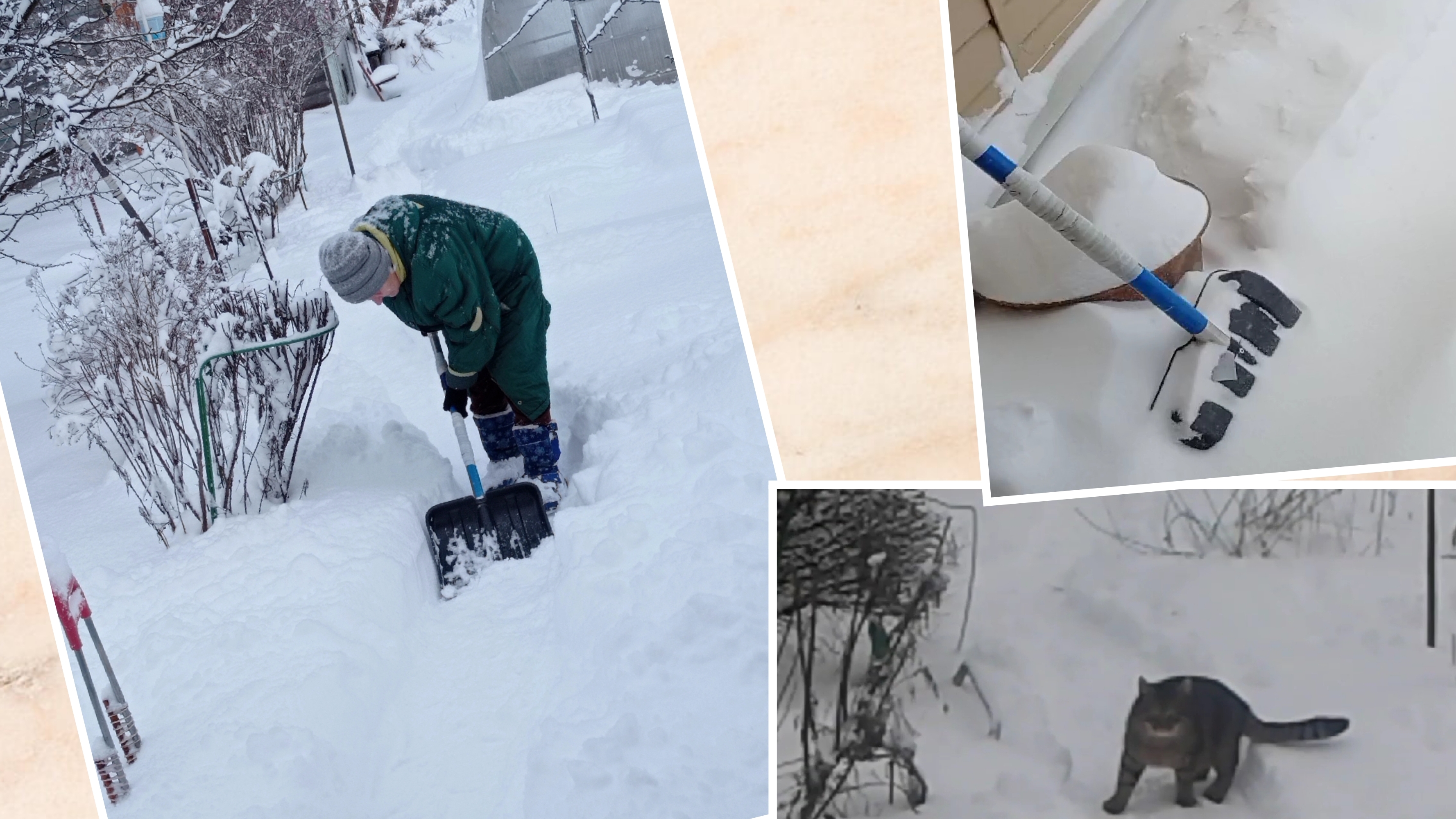 Сестра зимует на даче в Тульской области. Зима выдалась снежная, занесло всё дорожки. Как сестра борется со снегом. Кот Яша играет в снегу.