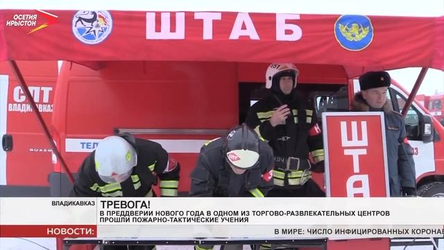 В преддверии Нового года в одном из торгово-развлекательных центров прошли пожарно-тактические учения. По легенде возгорание произошло в одном из залов кинотеатра на 4 этаже. Моментально сработала автоматическая пожарная сигнализация. Благодаря слаженной работе охраны и администрации центра в кратчайшие сроки были эвакуированы люди. Но по легенде учений из-за сильного задымления в одном из залов кинотеатра остались условные пострадавшие. На помощь им были направлены звенья газодымозащитной службы, которые эвакуировали их. Также к эвакуации людей, оставшихся в торговом центре, были привлечены спасатели Северо-Осетинского поисково-спасательного отряда МЧС России. В своей работе они использовали носилки. Другие «пострадавшие» были спасены с помощью автолестниц и коленчатого подъёмника. Архив от 25.12.2020г.