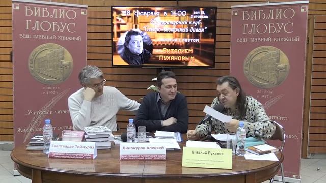 Гость клуба - поэт и писатель Виталий Пуханов --- «Библио-Глобус» – старейший книжный магазин в самом центре Москвы и один из крупнейших в Европе. У нас вы можете найти книгу на любой вкус из 200 тысяч наименований. Мы предлагаем широкий выбор изданий на более чем тридцати иностранных языках. Ежедневно мы проводим встречи с вашими любимыми авторами и ждём вас на заседаниях наших читательских клубов по интересам. Все права на настоящие аудио-, видеоматериалы защищены и охраняются законом. Использование материалов без согласия ООО Торговый Дом «БИБЛИО-ГЛОБУС» не допускается. Мы в социальных сетях: VK: https://vk.com/biblioglobus_msk Facebook: https://www.facebook.com/biblio.globus/ Instagram: https://www.instagram.com/biblio.globus/ Twitter: https://twitter.com/Biblio_Globus С любовью, Ваш Библио-Глобус.