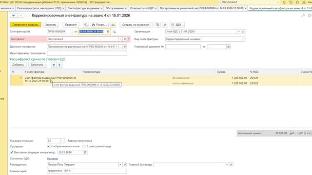 1С:ФРЕШ Бухгалтерия. Учет НДС 22%, предоплата 2025 г - доплата 2 процента 2026 г - реализация 2026 г