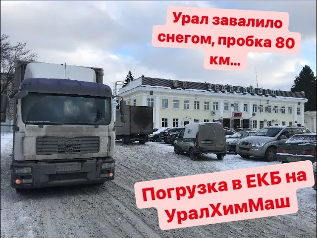 Ролик 77. Погрузка на заводе УРАЛХИММАШ. Кургазак. Урал завалило снегом. Пробка длинною 80 км...