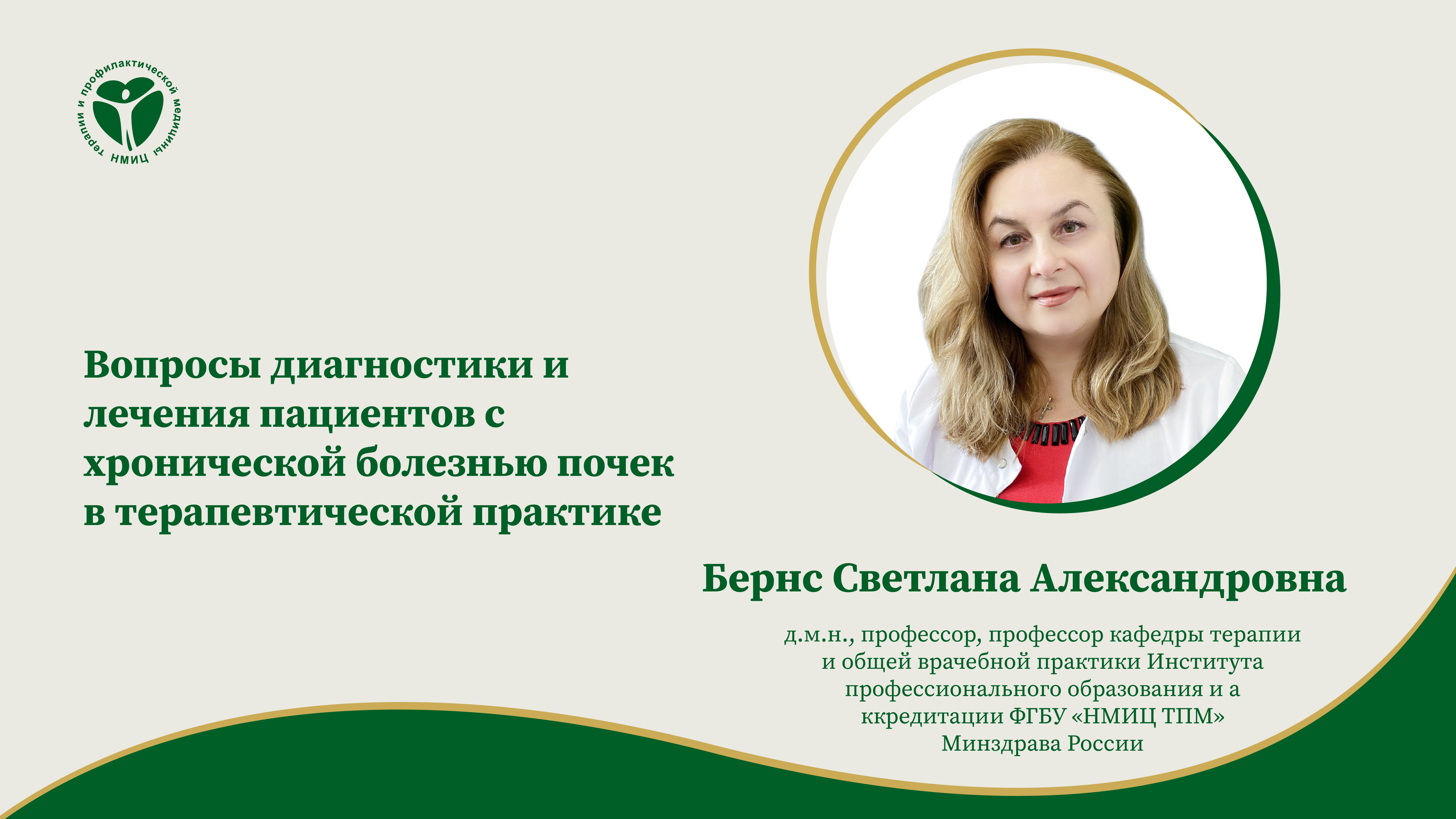 «Вопросы диагностики и лечения пациентов с хронической болезнью почек в терапевтической практике», лекция от 28.03.2024. Лектор: Бернс Светлана Александровна — д.м.н., профессор, профессор кафедры терапии и общей врачебной практики Института профессионального образования и аккредитации ФГБУ «НМИЦ ТПМ» Минздрава России.