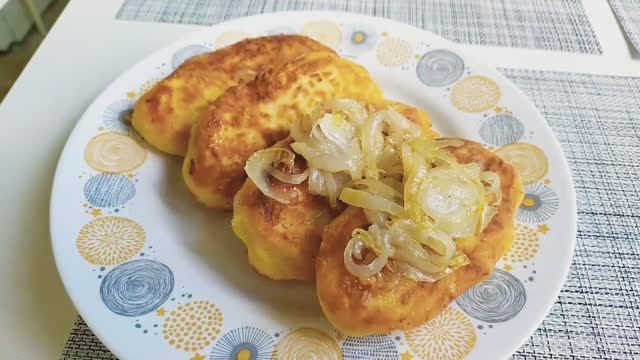 Картофельные котлеты с жареным луком на сковороде