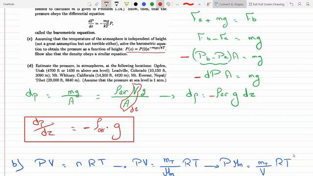 An Introduction to Thermal Physics Daniel V. Schroeder Problem 1-16 Consider a horizontal slab of air whose thickness (height) is dz. if this slab is at rest the pressure holding it up from below must balance both the pressure from above and the weight of the slab. Use this fact to find an expression for dP/dz, the variation of pressure with altitude in terms of the density of air b) Use the ideal gas law to write the density of air in terms of pressure, temperature and the average mass m of the air molecules. ( Take air as 78% N2, 21% O2 and 1 % argon. Show then that the pressure obeys the differential equation dp/dz=-mgP/kT c) Assuming that the temperature of the atmosphere is independent of height, solve the barometric equation to obtain the pressure as a function of height P(z)=P(0)e^-(mgz/kT). Show also that the density obeys a similar equation