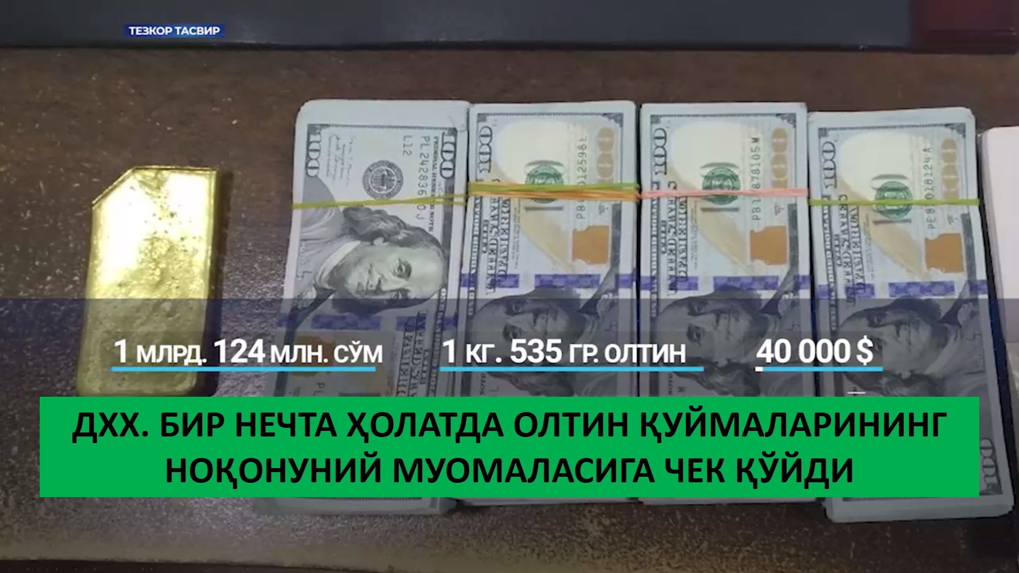 Давлат хавфсизлик хизматининг Наманган вилояти бўйича бошқармаси ходимлари томонидан бошқа ҳуқуқ-тартибот идоралари билан ҳамкорликда ўтказилган тезкор тадбирлар натижасида олтин қуймаларнинг ноқонуний муомаласига чек қўйилди. Дастлаб Андижон шаҳрида яшовчи, 1984 й.т., муқаддам судланган шахс оғирлиги 672 гр. бўлган бир бўлак олтин қуймасини Наманган шаҳрида истиқомат қилувчи, 1981 й.т. заргарга 40 минг АҚШ долларига сотган вақтида уларнинг иккаласи ҳам ушланди. Сўнгра ушбу заргар буюртмасига кўра, Олмалиқ шаҳридан оғирлиги 613 гр. бўлган бир бўлак олтин қуймасини олиб кетаётган Наманган шаҳрида яшовчи, 1986 й.т. фуқаро бошқарувидаги “Кобальт” русумли автомашина Чуст туманида тўхтатилиб, ашёвий далил процессуал тартибда расмийлаштириб олинди. Бошқа бир ҳолатда эса Наманган шаҳрида яшовчи, 1991 й.т., муқаддам судланган шахс Поп тумани ҳудудида Ангрен шаҳрида истиқомат қилувчи, 1988 й.т. фуқаро билан учрашиб, ундан оғирлиги 250 гр. бўлган 3 та олтин қуймасини сотиб олган вақтида уларнинг иккаласи ҳам ушланди. Ўтказилган тезкор тадбирлар натижасида умумий баҳоси 1 млрд. 124 млн. сўмлик, жами 1 кг 535 гр. олтин қуймалари ҳамда 40 минг АҚШ доллари ашёвий далил сифатида олинди.