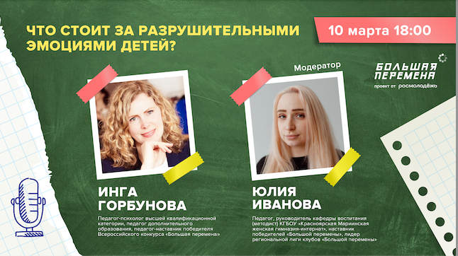 ❗Что стоит за разрушительными эмоциями детей? Так звучит тема нашего следующего стрима . Обсудим сложные случаи из педагогической практики с нашим гостем – педагогом-психологом высшей квалификационной категории, педагогом дополнительного образования, педагогом-наставником победителя Всероссийского конкурса «Большая перемена» Ингой Горбуновой. ?Своими историями на эту тему можете делиться в комментариях. А проведет эфир педагог, руководитель кафедры воспитания (методист) КГБОУ «Красноярская Мариинская женская гимназия-интернат», наставник победителей «Большой перемены», лидер региональной лиги клубов «Большой перемены» Юлия Иванова. Завершим рабочую неделю вместе с «Учительской»! #УчительскаяБольшойПеремены