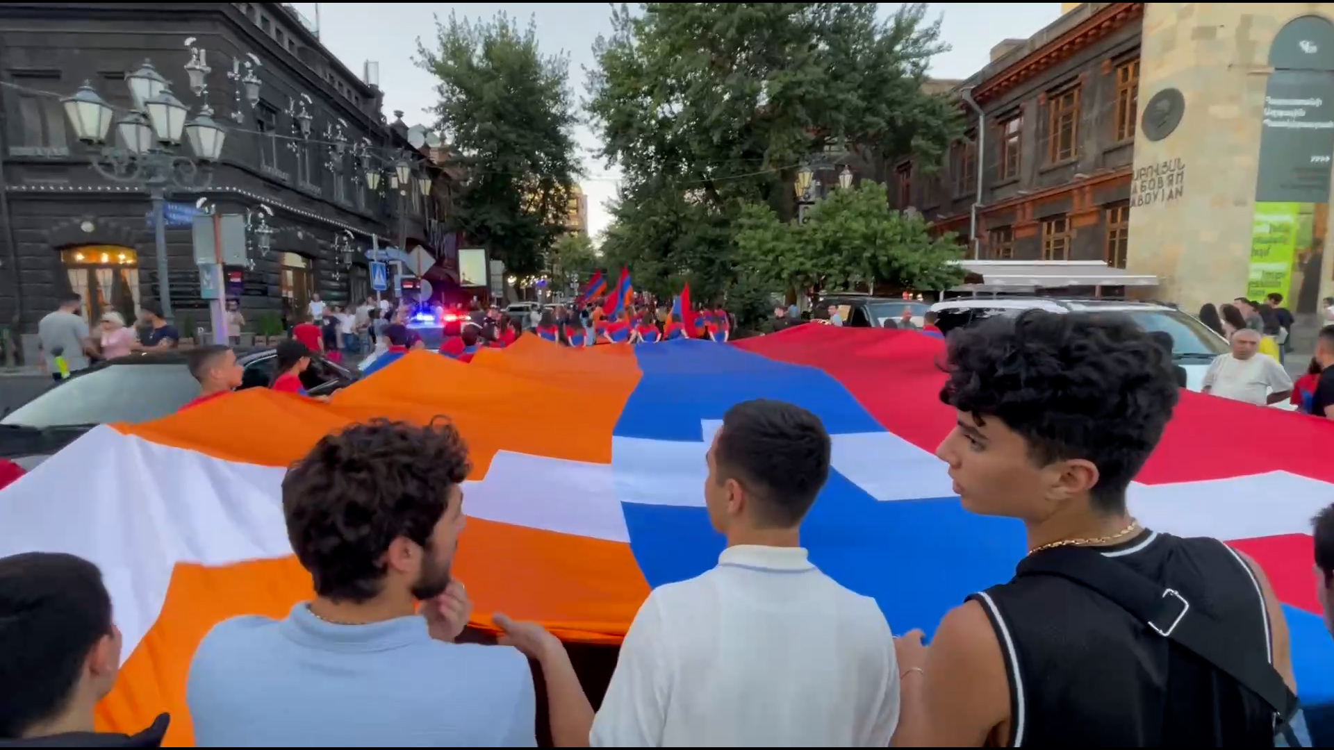 Участники шествия несут в руках флаги Армении. В небе над Ереваном кружит вертолет с прикрепленным триколором.