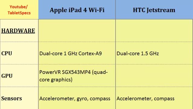 Apple iPad 4 Wi-Fi VS HTC Jetstream, Details comparison : iPad 4 Wi-Fi VS Jetstream, The phones compared in terms of: Dual-core, 1 GHz Cortex-A9, 1536 x 2048 pixels, 9.7 inches, Dual-core, 1.5 GHz, 800 x 1280 pixels, 10.1 inches, Operating System, LTE, Loudspeaker, Card slot, Processor, GPS etc