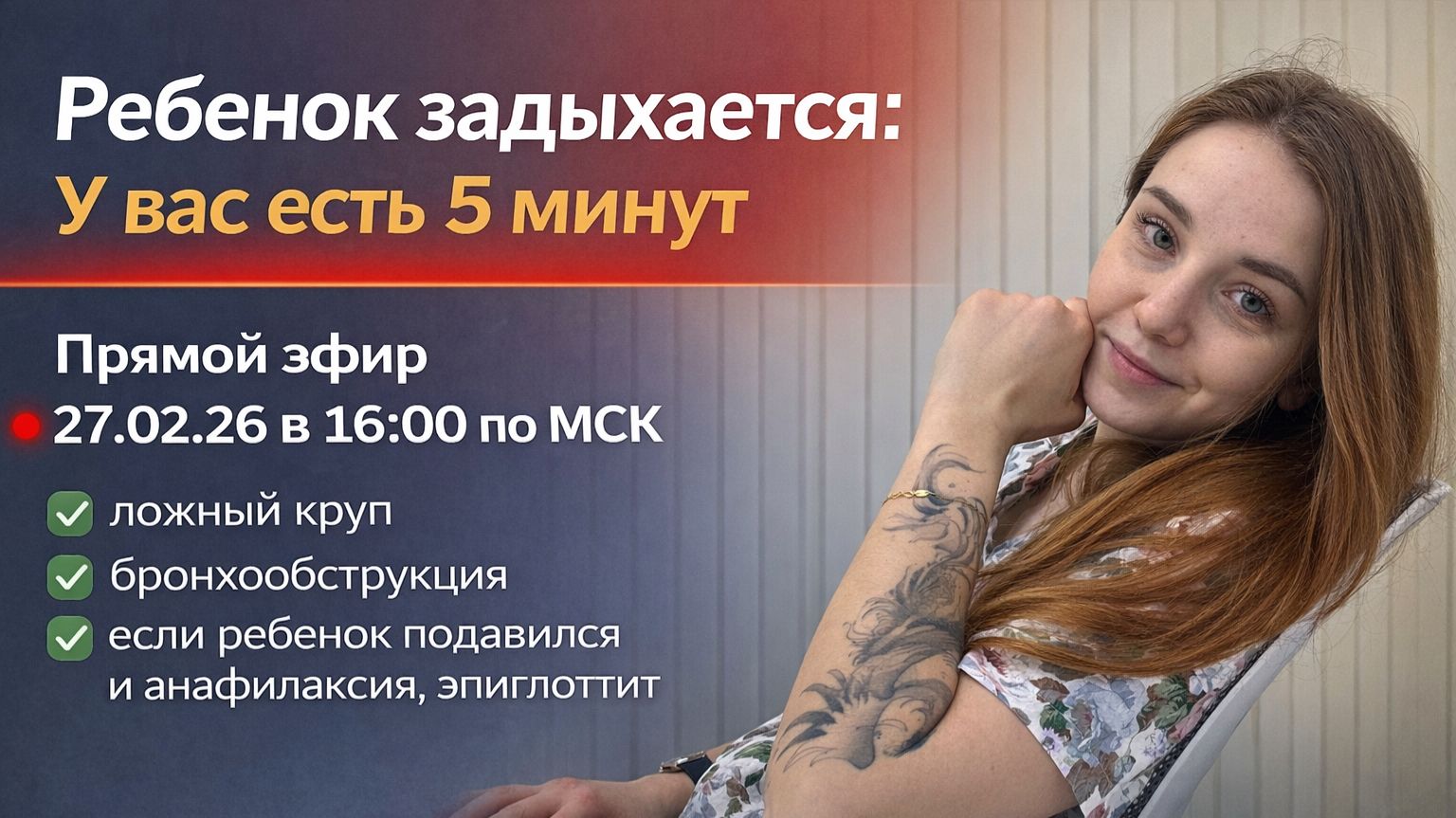 Страшный сон любой мамы — когда ребенок внезапно перестает дышать или заходится в лающем кашле среди ночи. В такие моменты паника парализует, а скорая физически не может приехать за 60 секунд. Знать алгоритм действий — это не «быть тревожной мамой», это быть защищенным родителем. На прямом эфире 27.02.26 в 16:00 по МСК мы разберем: ✅ Ложный круп: почему нельзя греть и зачем нужен холодильник. ✅ Бронхообструкция: как распознать «свист» и помочь. ✅ Если ребенок подавился: почему хлопать по спине — это фатальная ошибка? ✅ Эпиглоттит и анафилаксия: красные флаги, когда счет идет на секунды. Я дам четкую инструкцию из 12 слайдов, которую вы сможете заскринить и сохранить. Мои соцсети (подписывайтесь, там еще больше пользы): 🔹 ВКонтакте: https://vk.com/doctorgribanova2 - здесь разбираю ваши случаи и отвечаю на вопросы. 🔹 Telegram: https://t.me/grib_evg_doc экстренные советы и чек-листы для родителей. Берегите детей и лечитесь с умом! 🔔 Ставьте колокольчик, чтобы не пропускать новые разборы. #педиатр #доказательнаямедицина #орви #детскаяаптечка #виферон #здоровьеребенка #ренгалин #нурофен