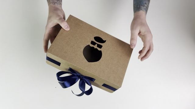 Новогодняя коробка Gofromir - 300х200х65 бурая с синей лентой (с вырезом "дед мороз")