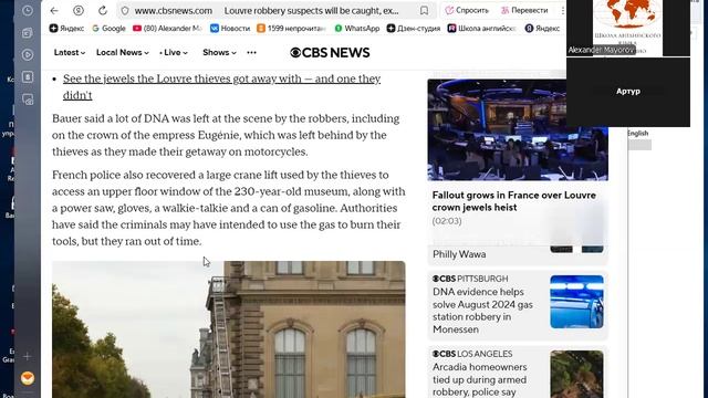 Школа Английского Языка в Пушкино _ Качественное образование в России _ Взрослые Фокус урока – разговорный английский Читаем неадаптированную статью из влиятельного источника… Очень кратко изложу суть статьи… 5 дней том назад грабители похитили из Лувра сокровища на сумму 102 миллиона долларов… Ограбление произошло среди белого дня, когда в музее были посетители… Из посетителей никто не пострадал… Полиция надеется найти похитителей, НО вероятность возвращения Лувру украденные сокровища очень МАЛА… В процессе урока расширяем словарный запас с разбором грамматики, исходя из обсуждаемой тематики… А. Майоров 24 октября 2025 PS 1 Взрослые приходят к нам по разным причинам… В том числе и для реанимации языка… ведь язык имеет свойство достаточно быстро забываться (а иногда и исчезать практически полностью, особенно разговорный), если нет регулярной его (языка) практики употребления… Естественно, что урок структурируется под УРОВЕНЬ обучающегося… PS 2 Занимайтесь с профессионалами – сильно сэкономите!!!