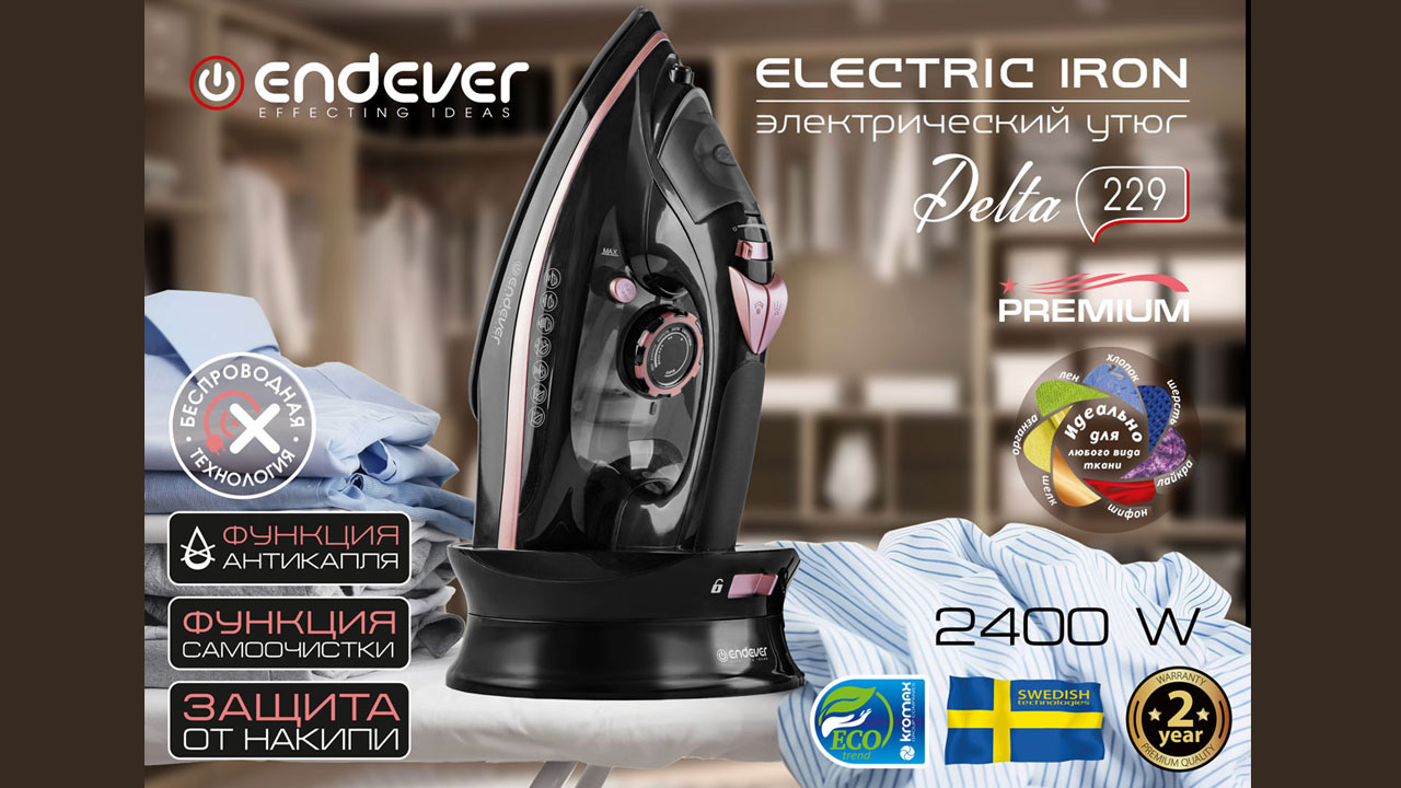 Endever Delta-229: новая эра глажки Endever Delta-229 - это симфония стиля, мощи и инноваций, созданная для удовлетворения самых высоких ожиданий. Этот беспроводной электрический утюг станет вашим надежным спутником в уходе за одеждой. Беспроводная свобода: С Delta-229 вы освобождаетесь от проводов. Его беспроводное использование позволяет вам гладить где угодно, без ограничений розеток. Это свобода, которую вы заслуживаете. Мощь и производительность: С мощностью 2400 Вт, Delta-229 нагревается моментально, а подача пара до 45 г/мин и паровой удар до 140 г/мин обеспечивают безупречные результаты. Этот утюг справляется с самыми сложными складками и тканями. Подошва из керамики: Керамическая подошва гарантирует идеальное скольжение и равномерное распределение тепла. Размер подошвы 22,9x12,1 см делает глажение больших поверхностей простым и эффективным. Инновационные технологии: Delta-229 оснащен уникальной системой индикации нагрева, которая дает вам точную информацию о готовности утюга к работе. Индикация уровня воды позволяет вам всегда знать, когда пора долить воду. Безопасность и комфорт: Система защиты от накипи продлевает срок службы устройства, а противокапельная система предотвращает разлив воды на ткань. Удобное скручивание и хранение провода питания облегчают хранение. Универсальность и гибкость: Delta-229 предлагает сухой и влажный режим глажения, а также мелкодисперсное разбрызгивание. Регулировка температуры позволяет вам настроить утюг под каждый тип ткани. Endever Delta-229 - это символ совершенства и инноваций в мире глажки. Он преобразит вашу повседневную жизнь, делая уход за одеждой простым и эффективным. Это не просто утюг, это новая эра глажки. Подробнее https://www.endever.su/catalog/irons/endever_delta_229/