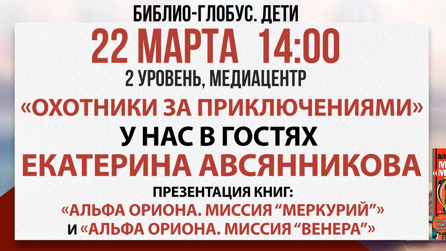 Представляем запись презентацию серии книг Екатерины Авсянниковой «Охотники за приключениями» и викторину для юных читателей. Екатерина – автор книг «Альфа Ориона. Миссия "Меркурий"», «Альфа Ориона. Миссия "Венера"». В книге «Альфа Ориона. Миссия "Меркурий"» рассказывается о приключениях мальчика Мишки Сорокина, для которого страсть к конструированию превращается в череду невероятных путешествий к звёздам на космолёте «Альфа Ориона». Юные читатели узнают о далёких созвездиях, причудливых законах вселенной и характере самой близкой к Солнцу планеты — Меркурия. В книге «Альфа Ориона. Миссия "Венера"» настоящая карта Венеры, составленная профессиональными астрономами, поможет героям и читателям в увлекательном путешествии на одну из самых загадочных планет Солнечной системы. ____________________________ «Библио-Глобус» – старейший книжный магазин в самом центре Москвы и один из крупнейших в Европе. У нас вы можете найти книгу на любой вкус из 200 тысяч наименований. Мы предлагаем широкий выбор изданий на более чем тридцати иностранных языках. Ежедневно мы проводим встречи с известными авторами, актерами и спортсменами, организуем музыкальные квартирники и детские мероприятия, предоставляем площадку для театральных постановок и много другого. Все права на настоящие аудио-, видеоматериалы защищены и охраняются законом. Использование материалов без согласия ООО Торговый Дом «БИБЛИО-ГЛОБУС» не допускается. Наш сайт: http://www.biblio-globus.ru/ Мы в социальных сетях: VK: https://vk.com/biblioglobus_msk Telegram: https://t.me/biblioglobus_1 С любовью, Ваш "Библио-Глобус"