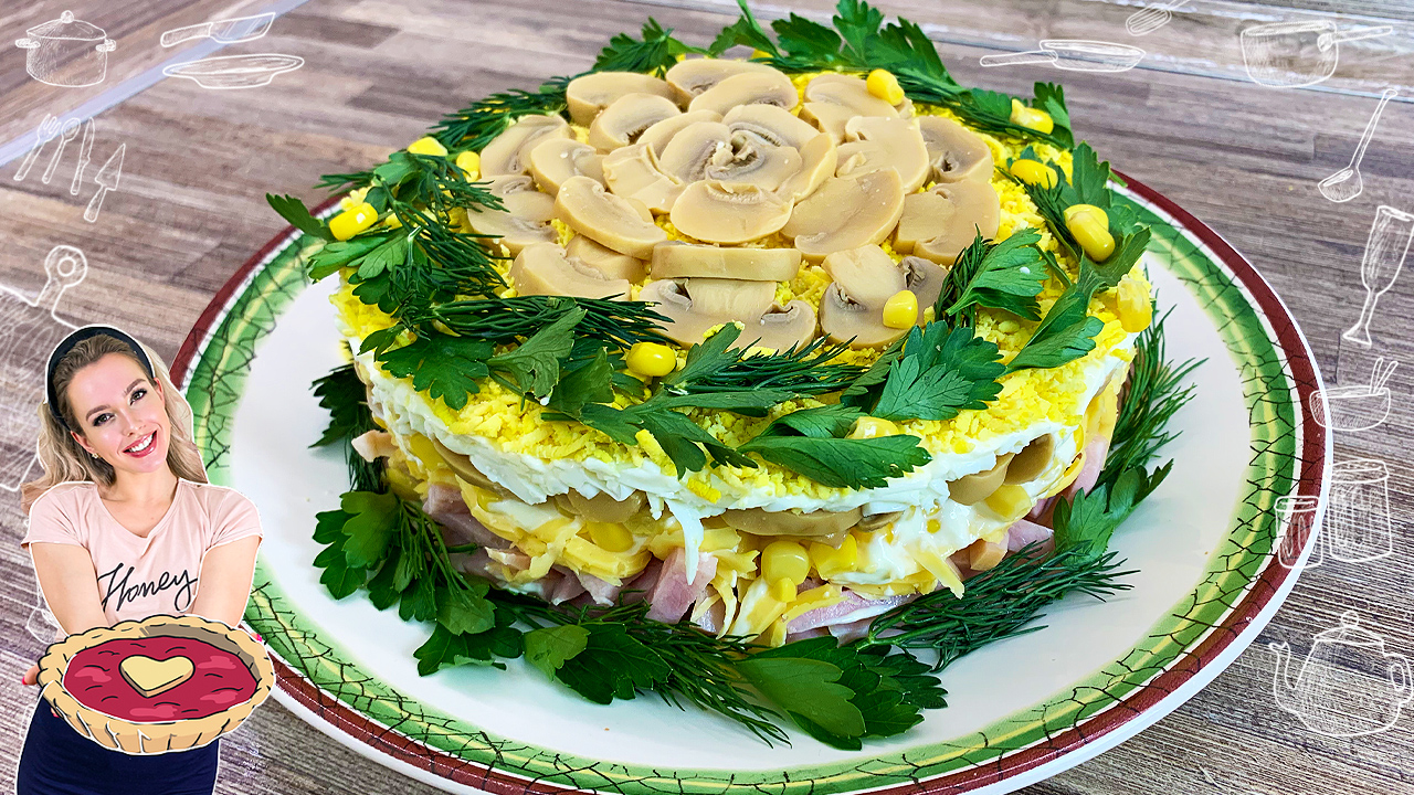 Слоеный салат с ветчиной Рецепт салата: Ветчина - 250 г. Сыр - 100 г. Кукуруза - 200 г. Маринованные шампиньоны - 1 маленькая баночка Яйца - 4 шт. Майонез - 4 ст.л Петрушка - 3-4 веточки #слоеныйсалат #салатсветчиной #салат #салаты #рецепты #рецепт #салатынановыйгод #салатсгрибами