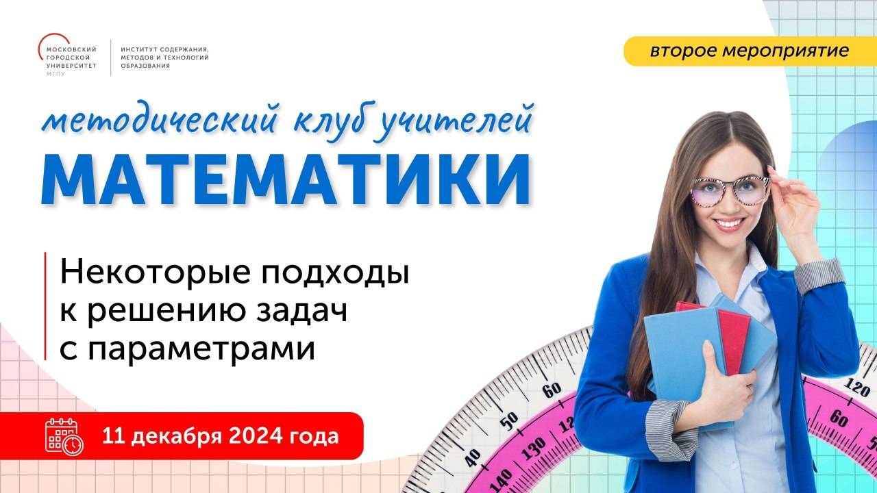 "Приглашаем учителей математики 11 декабря в 16:00 на онлайн-заседания Методического клуба. На встрече будут обсуждаться подходы к решению задач с параметрами, являющихся одним из самых трудных разделов математики и требующих от обучающихся развитого логического мышления и высокого уровня математической культуры. Спикеры мероприятия: Андрианова Юлия Владимировна, старший преподаватель кафедры математического анализа механико-математического факультета МГУ им. М. В. Ломоносова Рощина Наталья Леонидовна, методист ИСМиТО МГПУ, кандидат педагогических наук Модератор встречи: Зеленова Елена Викторовна, старший методист отдела методологии и перспективной дидактики ИСМиТО МГПУ"