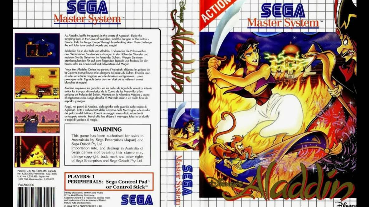 "ALADDIN" - видео игра в жанре платформер, разработанная компанией SIMS Co. Ltd. в 1994 годы для SEGA MASTER SYSTEM и GAME GEAR. Основана на одноименном анимационном мультфильме 1992 года от кинокомпании WALT DISNEY. Игра представляет собой совершенно нетипичный платформер с боковой прокруткой с элементами квеста, спидрана и стелс-экшена. Главный герой - молодой мелкий воришка, вся жизнь которого сплошное приключение. Чтобы как-то выжить, ему приходится воровать хлеб и яблоки. Кроме Аладдина в игре можно увидеть других известных по мультфильму героев. Сюжетная линия является сильной стороной этой игры, в ней огромное количество кат-сцен, и, иногда кажется, что это интерактивный мульт, который изредко прерывается геймплеем. Аладдину придётся убегать от охраны, проходить различные ловушки, прокрадываться мимо стражи, летать на ковре-самолёте. Графика игры на уровне 16-bit консолей, качественная прорисовка радует глаз яркими красками и наполненными задними фонами. Знакомые локации должны обязательно понравиться поклонникам мультипликационной ленты. На MASTER SYSTEM сюжет мультфильма пересказан лучше всего. Игра состоит из 10 уровней, каждый из которых представляет собой различные локации Аграбы. Характеристики звука внушительные для того времени, музыкальное сопровождение включает треки из мультфильма, а звуковые эффекты создают захватывающую атмосферу восточных сказок.