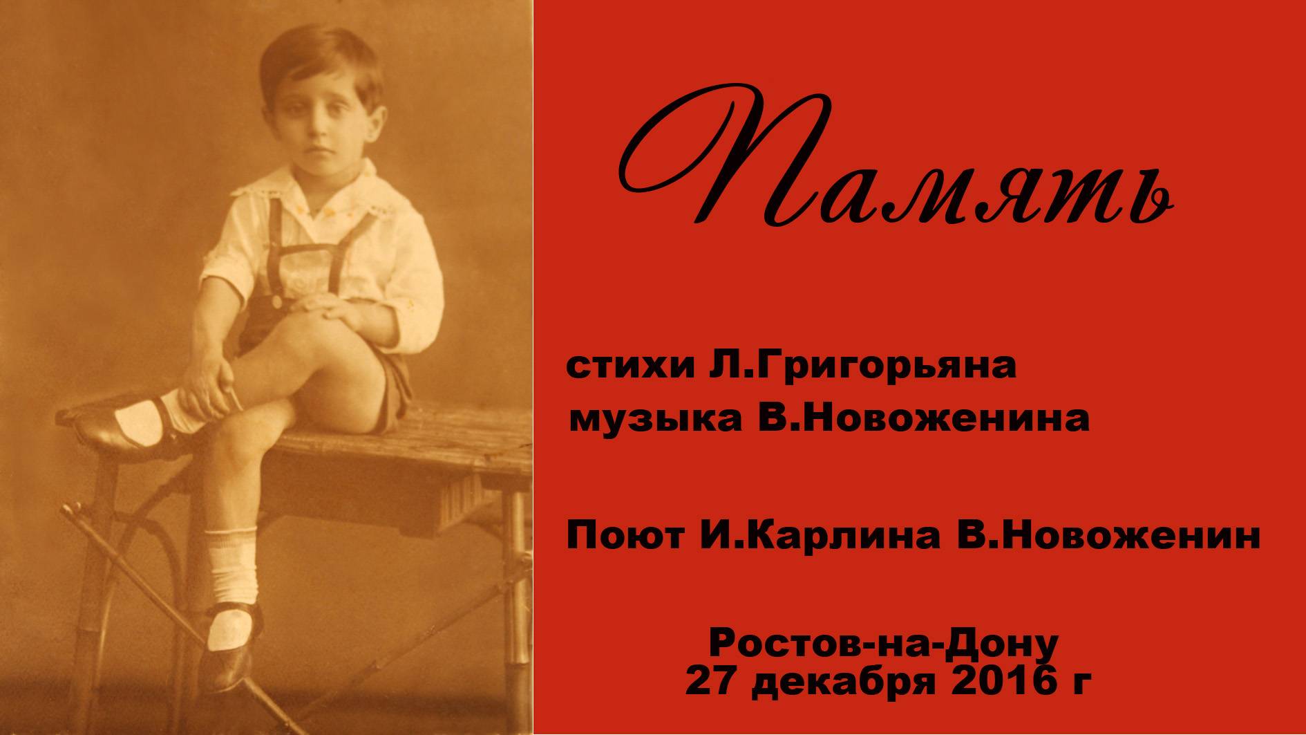 27 декабря-день рождения нашего друга поэта Леонида Грирорьяна. Песня "Память" (ст.Л.Григорьяна,муз.В.Новоженина) звучит в исполнении дуэта из Ростова-на-Дону И.Карлиной и В.Новоженина