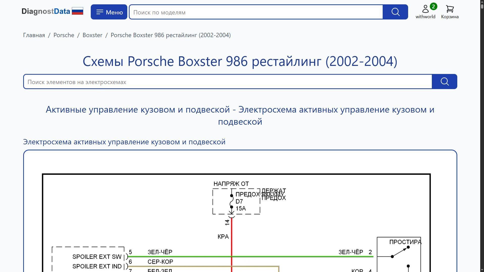 https://diagnostdata.ru/porsche/boxster/986-2002-2004/ Электрохемы, распиновки, схемы электропроводки Porsche Boxster 986 рестайлинг (2002, 2003, 2004 годов выпуска) 2.7L, 3.2L Схемы на русском языке для систем: Схемы Активные управление кузовом и подвеской, Схемы Кондиционирование воздуха, Схемы Антиблокировочная система abs, Схемы Сигнализация, Схемы Can шина, Схемы Вентилятор охлаждения, Схемы Круиз-контроль, Схемы Подогрев стекол, Схемы Электронный глушитель, Схемы Двигатель, Схемы Фары и фонари, Схемы Точки подключения масс, Схемы Фары, Схемы Клаксон, Схемы Приборная панель, Схемы Освещение салона, Схемы Память, Схемы Системы помощи водителю, Схемы Блок предохранителей и реле, Схемы Центральный замок, Схемы Управление зеркалами заднего вида, Схемы Сиденья, Схемы Складная крыша/люк, Схемы Стеклоподъемники, Схемы Магнитола, Схемы Блокировка селектора, Схемы Стартер/генератор, Схемы Подушки безопасности, Схемы Коробка передач, Схемы Багажник, задняя дверь, лючок топливного бака, Схемы Дворники и омыватели, и др.