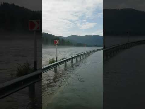 Едем по дороге от Телецкого озера залитой водой из реки Бии. Неделя стояла жара на Алтае, интенсивно таяли ледники и Телецкое озеро и реки вышли из берегов.