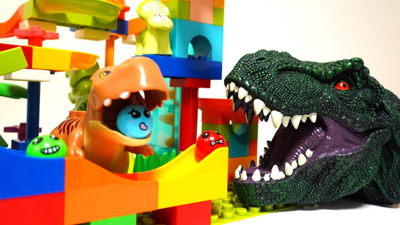 Строим разноцветный конструктор с фигурками динозавров и скатываем с горки шарики 🎈 вмести с детьми